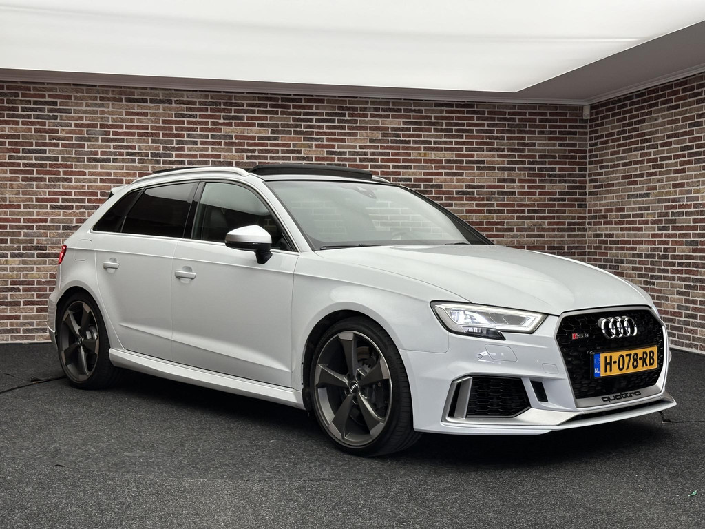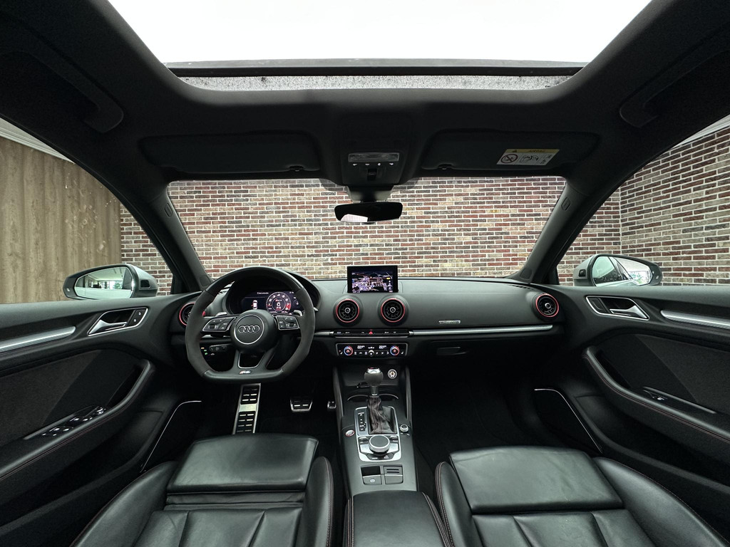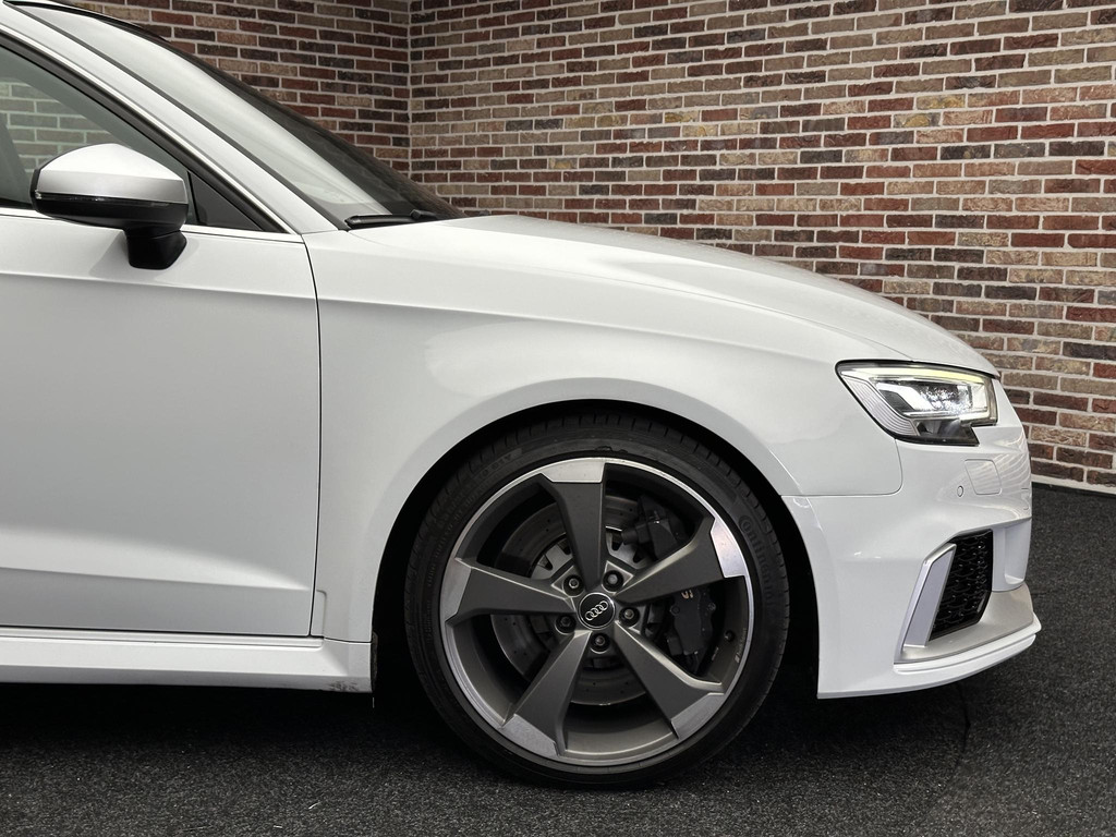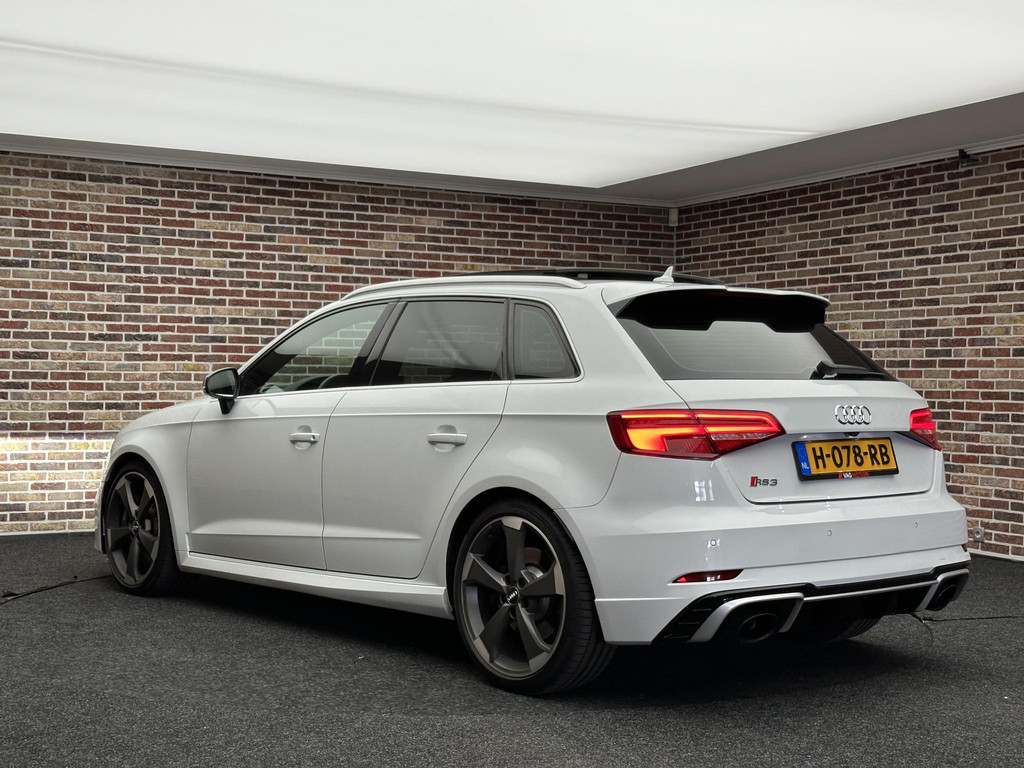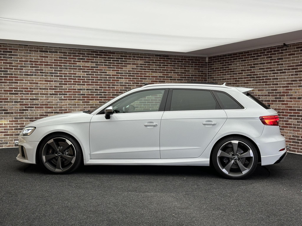 In het moderne verkeer hebt u achter het stuur van de Audi RS3 Sportback altijd de controle. Deze auto komt uit 2018. De vijfcilinder benzinemotor in combinatie met de automatische transmissie maken het rijden met deze Audi tot een waar feest. Iedereen kan het beamen: een lederen interieur is levend en luxe. Om van comfort nog maar te zwijgen. En dat komt allemaal nog beter tot z'n recht dankzij het elektrisch bediende glazen panorama dak. Tijdens koude winterdagen verjaagt uw stoelverwarming de kou en maakt het rijden heerlijk comfortabel. Dankzij de matrix LED-verlichting geven de koplampen ook in het donker daglicht. Bij de uitrusting van deze auto horen onder meer 19 inch lichtmetalen velgen, sportonderstel, adaptief dempingsysteem, warmtewerend glas, in delen neerklapbare achterbank en verstelbare lendensteunen.