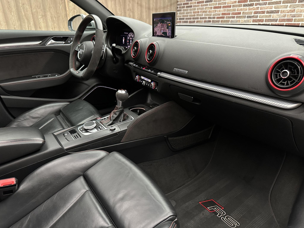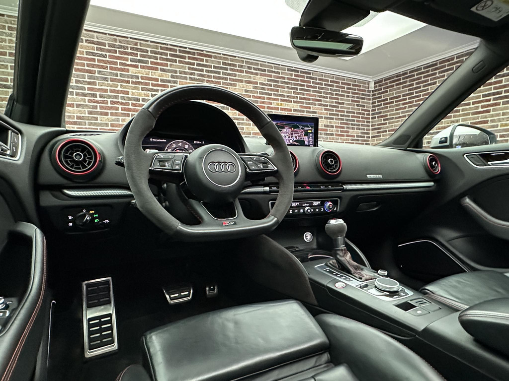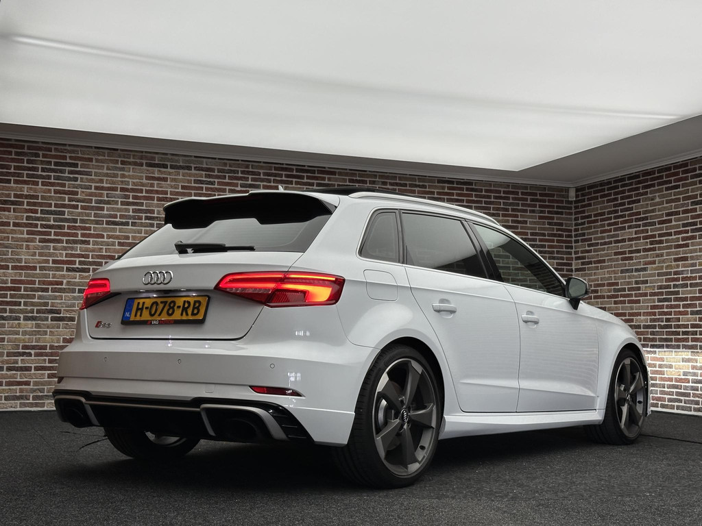 In het moderne verkeer hebt u achter het stuur van de Audi RS3 Sportback altijd de controle. Deze auto komt uit 2018. De vijfcilinder benzinemotor in combinatie met de automatische transmissie maken het rijden met deze Audi tot een waar feest. Iedereen kan het beamen: een lederen interieur is levend en luxe. Om van comfort nog maar te zwijgen. En dat komt allemaal nog beter tot z'n recht dankzij het elektrisch bediende glazen panorama dak. Tijdens koude winterdagen verjaagt uw stoelverwarming de kou en maakt het rijden heerlijk comfortabel. Dankzij de matrix LED-verlichting geven de koplampen ook in het donker daglicht. Bij de uitrusting van deze auto horen onder meer 19 inch lichtmetalen velgen, sportonderstel, adaptief dempingsysteem, warmtewerend glas, in delen neerklapbare achterbank en verstelbare lendensteunen.